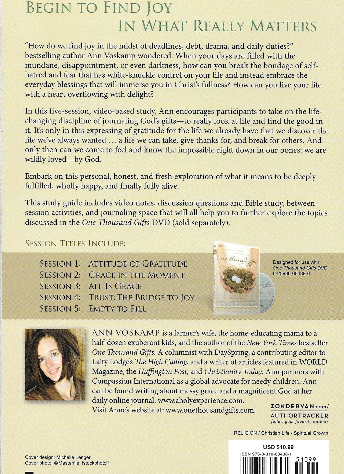 A Dare to Live Fully Right Where You Are. One Thousand Gifts Bible. The DVD includes five 18-20 minute video teaching sessions for Ann Voskamp from her farm in Ontario and the study guide includes video notes discussion questions and Bible study.